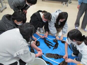富山県には昆布を使った郷土料理がたくさんありますが、北海道から乾燥して運ばれてきた昆布を使った料理で、生の昆布を食べるという食文化はありません。そこで、まずは昆布の生態を知るところから始めようと、昆布の生態や機能性について話を聞いたり、がごめ昆布と真昆布の養殖の苗付けを体験したりしました。