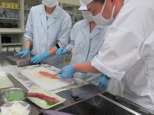 講師の方から説明を受けた後、学生は2人1組でふくらぎ1尾をおろすことに挑戦!皮をひく作業が特に難しかったものの、丁寧な指導のおかげで全員が無事に調理を終えることができました。あらを使ってあら汁を作り、刺身定食が完成しました!