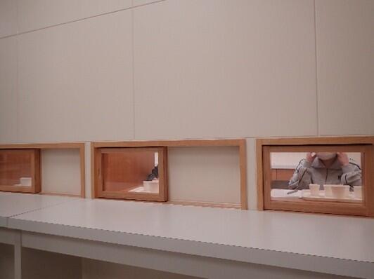 また、だしは官能評価室の外の準備室から、それぞれの席にある小さな扉を経て提供されます。こうすることで、試食の準備をしている人の様子や、提供されたお皿の見た目の情報が、評価に影響しないように工夫されています。