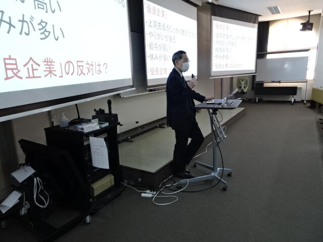 森井泉教授からは、1年後の就職活動に向けて今から準備すべきことの一つとして、企業の採用試験で出題される一般常識問題に挑戦してもらい、その解説を行いました。