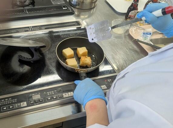 食物栄養学科では、「腎臓病の食事療法~フレンチトースト食べ比べ~」をテーマに、設備の整った調理学実習室にて低たんぱく食パンや粉あめを使用した腎臓病用のフレンチトーストと普通のフレンチトーストを調理して試食する体験プログラムを実施しました。
