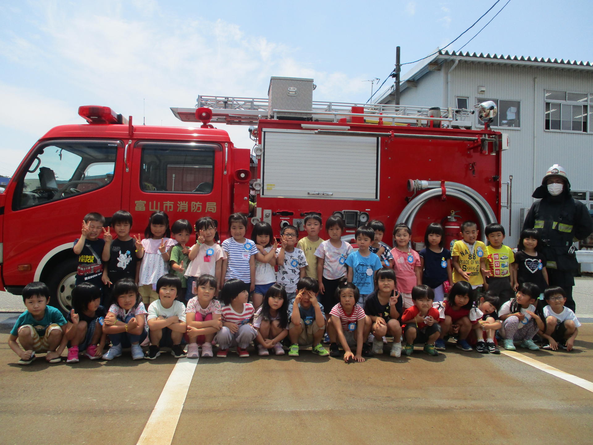 呉羽消防署から消防士3名が来園され、年長児がプレイルームで話を聞いたり、防火に関するビデオを見たりしました。また、「何歳になったら、消防士になれますか。」「消防自動車が赤色なのは、どうしてですか。」など、自分たちで考えた質問をすると、消防士の方が丁寧に答えてくださり、子どもたちは、真剣に聞いていました。
