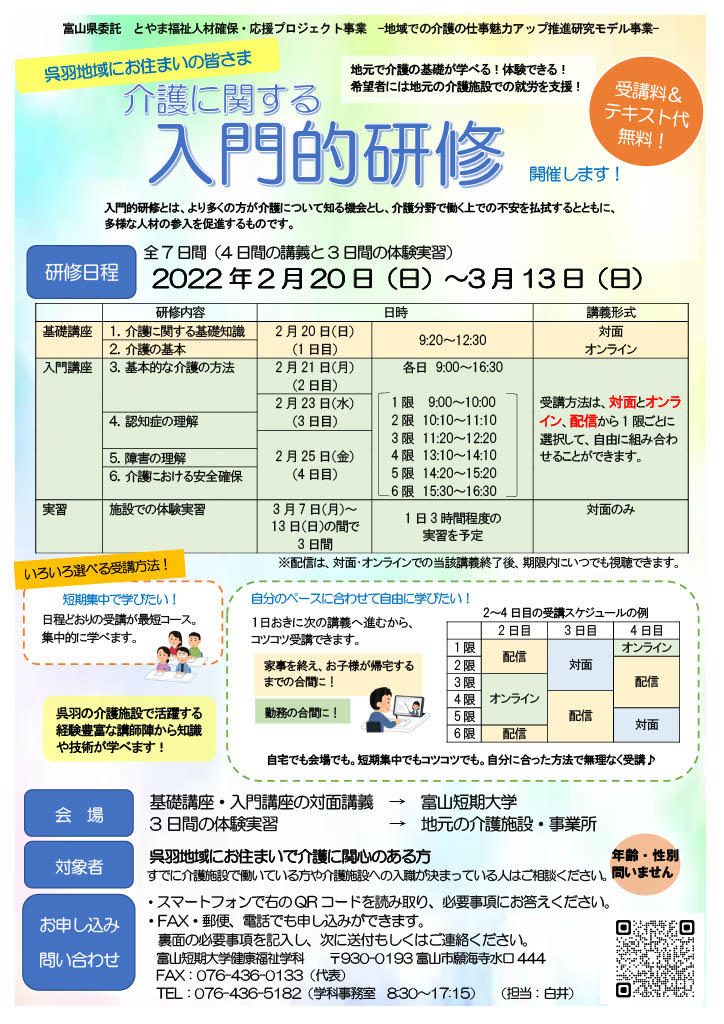 今回は、呉羽地域にお住まいの方を対象に、介護の基本的知識や技術が学べる講義と、地域の介護施設での体験実習ができる研修を実施します。