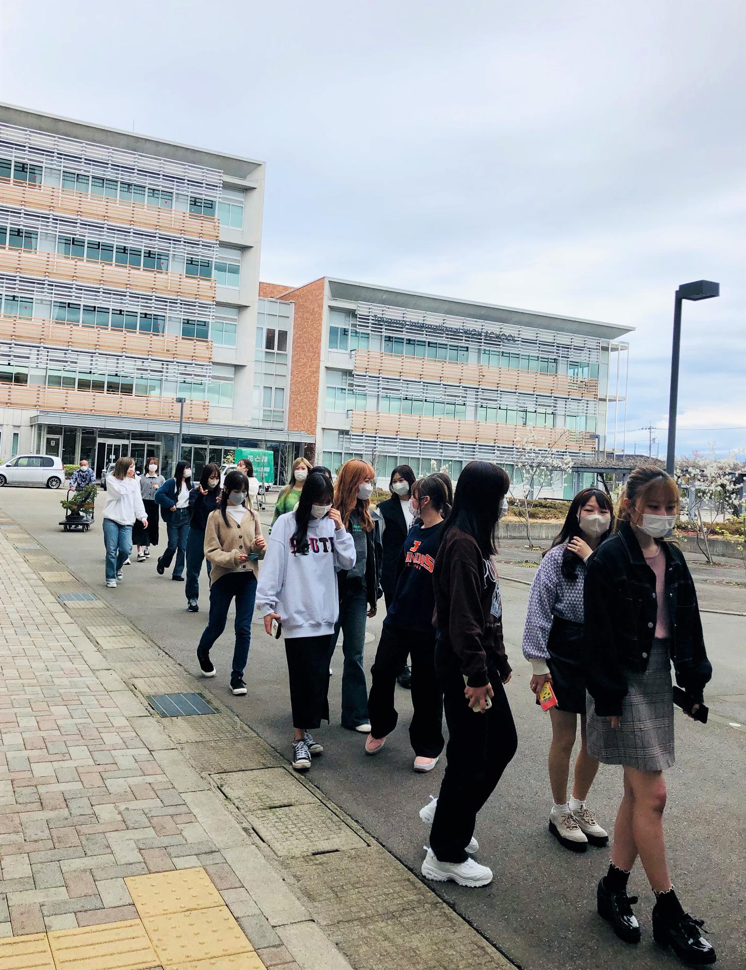 入学式翌日の4月6日(木)には、4グループに分かれてキャンパス内を約50分間かけて歩き、教員から建物や教室、手続きの窓口及び、研究室などの説明を受けながら、学内探検ツアーを行いました。
