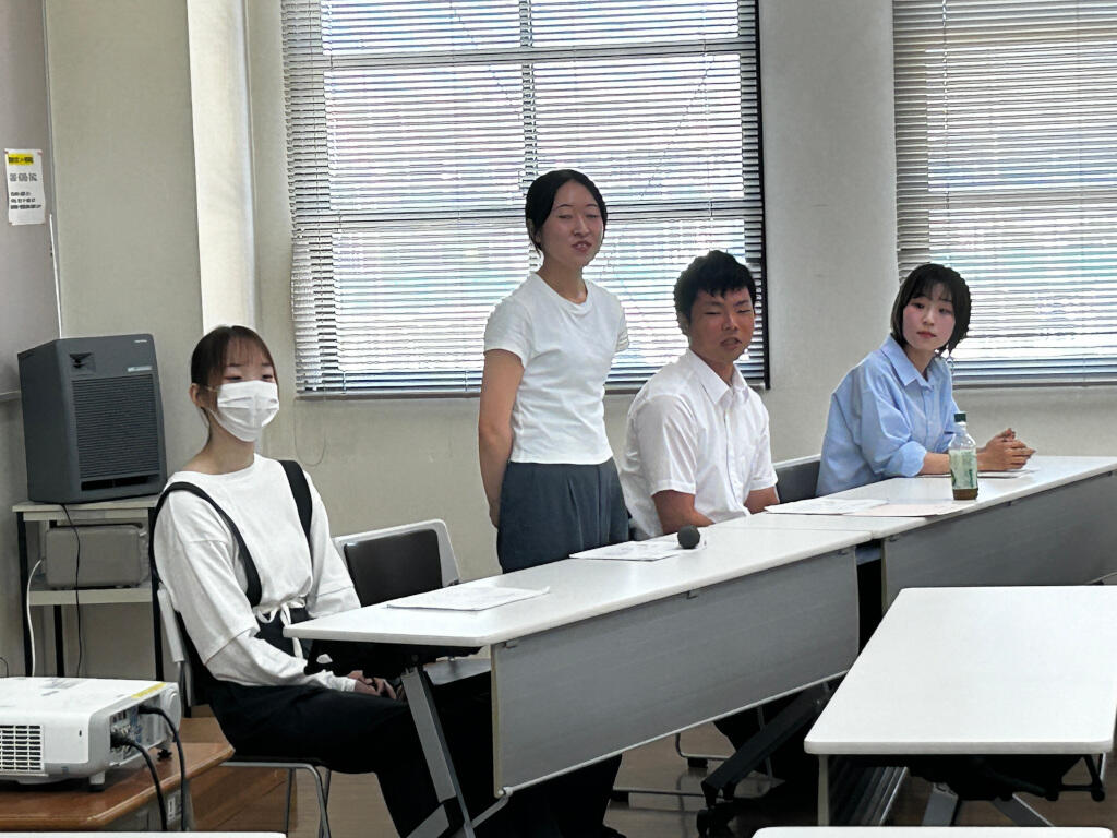 2025(令和7)年9月24日(水)、後期オリエンテーションに併せ、学科卒業後おおむね3年以内の卒業生4人を講師に招き、「先輩と語る会」を開催しました。それぞれの進路決定に至る取り組みとその後の経験を聴くことで、自分たちのキャリアプランについて考えることが目的です。