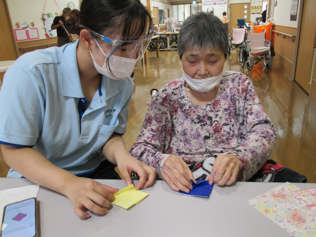 受け持ち利用者の方と鶴を折る様子(写真提供:ふなはし荘)