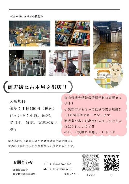 2025(令和7)年9月23日(火)、石動駅(あいの風とやま鉄道線)前の商店街にある旧「おもちゃの紅谷」において、経営情報学科の東野ゼミに所属する2年生10名が古本市を実施しました。