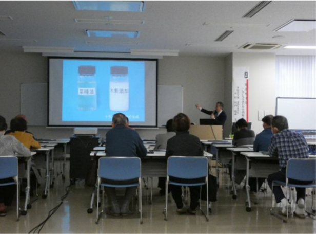 「健康を守る ~気になる食の安全問題~」というテーマで、10分の休憩をはさんで2時間の講演を行いました。はじめに食の安全について、基本的なことをクイズ形式を含めて解説しました。後半は、トランス脂肪酸とマイクロプラスチックの問題について、食の安全性という面からお話をしました。私たちが食べている多くの食品は、マイクロプラスチックに汚染されています。まだ、研究は始まったばかりで、その危険性についてはよくわかっていません。食品への汚染状況や健康へのリスクについて、現在わかっていることをお話しました。