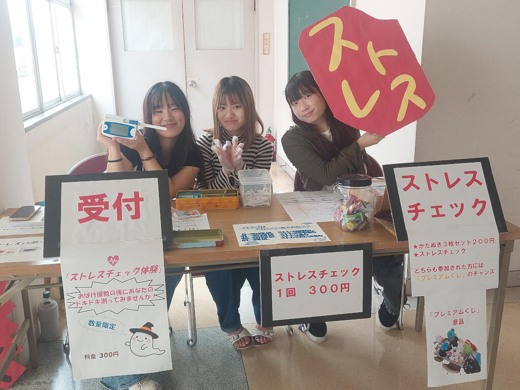 健康福祉学科からは2年生によるクラス企画として「かたぬき」と「ミニミニデイサービス」、「ストレスチェック」を出店しました。