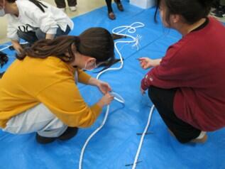 10mほどの太いロープに、富山県水産試験場で育ててもらったがごめ昆布と真昆布の赤ちゃん苗を縛っていきました。「大きくなあれ」と願いを込めて、解けないように、でも強すぎない様に、縛っていきました。12月冷たい富山湾に沈められ、養殖されます。