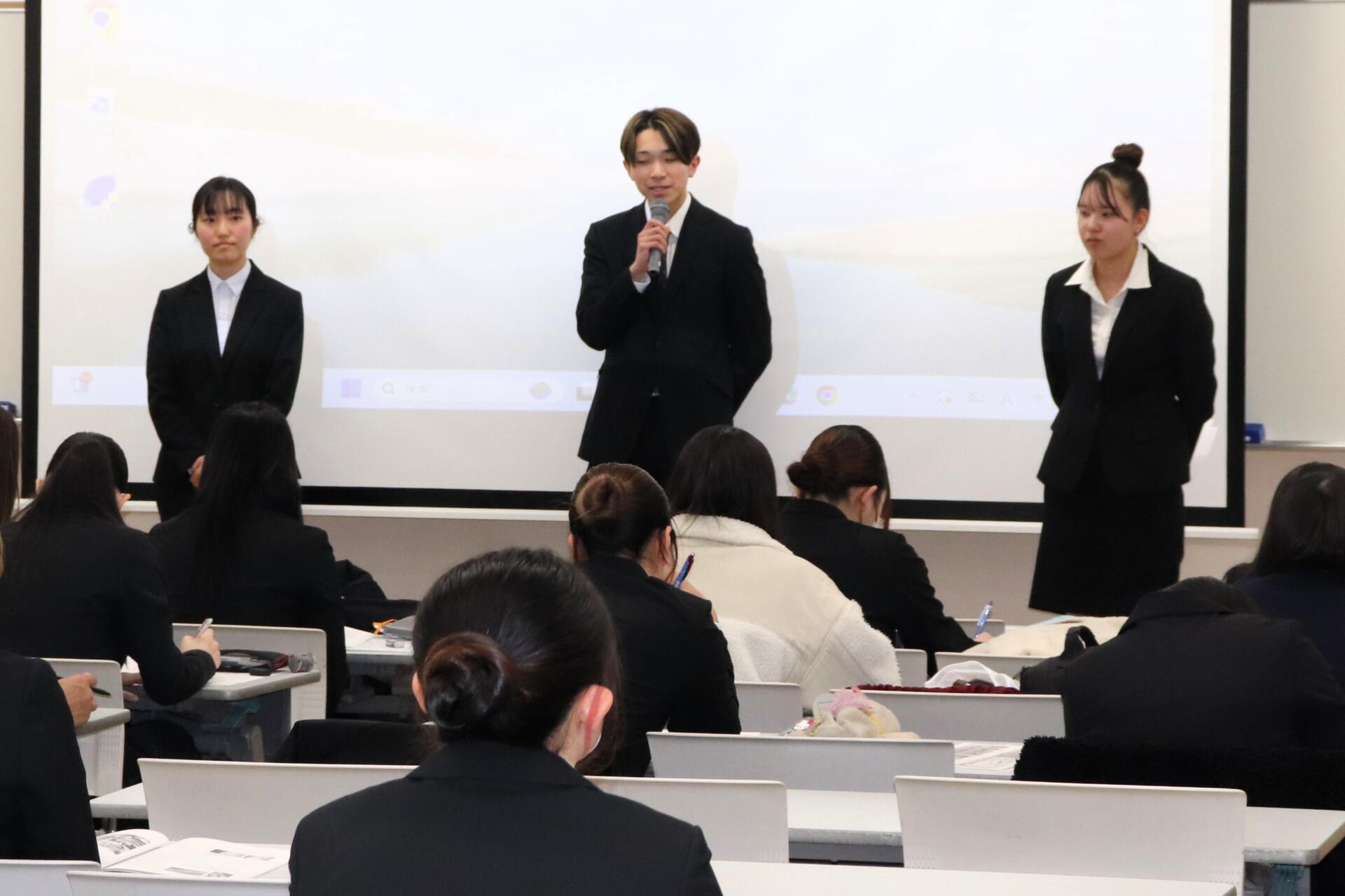 「総合演習」は、学生がこれまでの授業や実習で得た知識・問題意識をもとに、グループごとに研究テーマを設定し、調査・分析した結果をまとめて発表するもので、2年間の学びの集大成となる科目です。