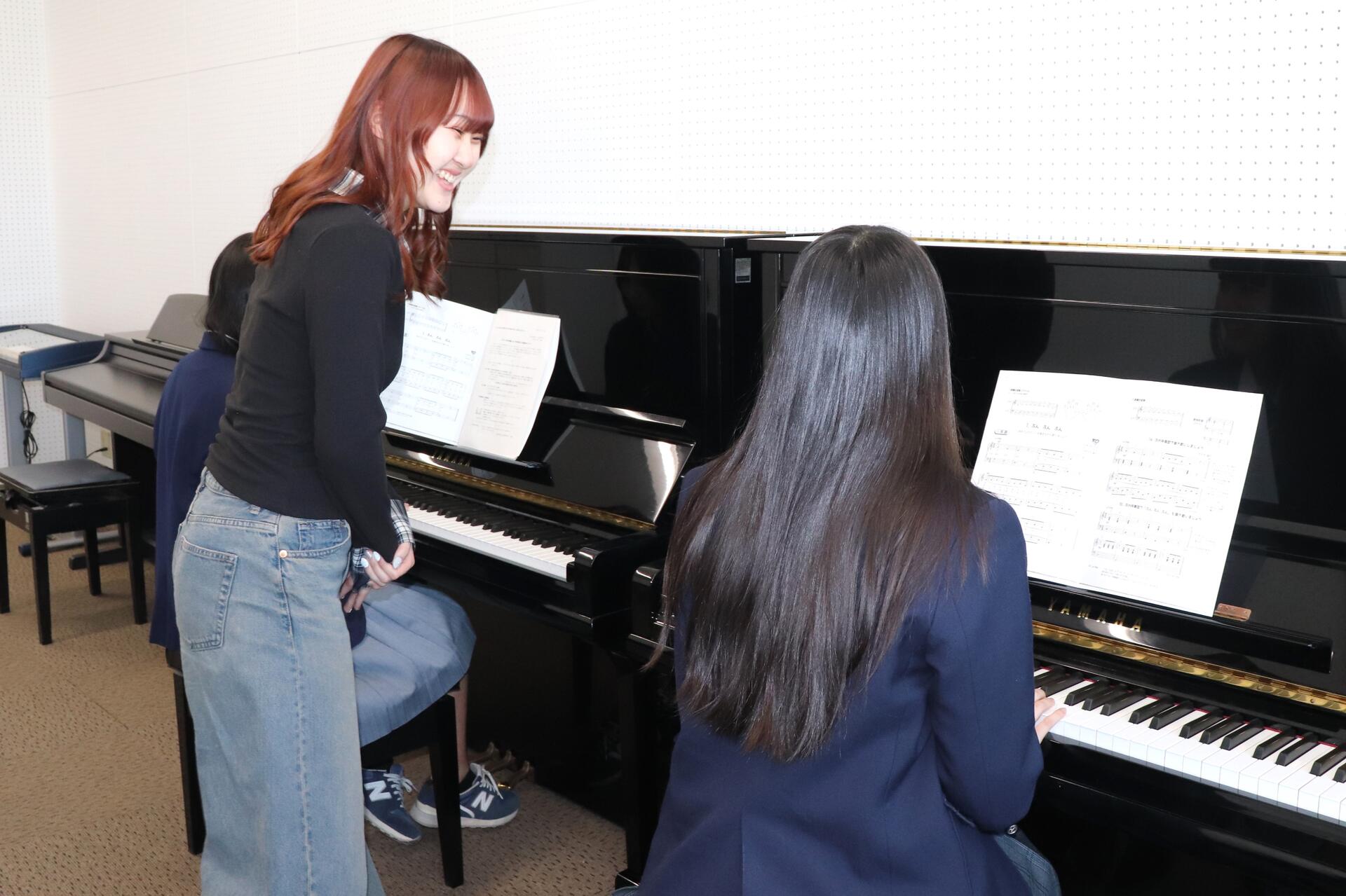 続いて、入学予定者の皆さんには、4グループに分かれて自己紹介を行ってもらい、それぞれ30分間の絵本紹介のグループワークとピアノの体験会に参加していただきました。