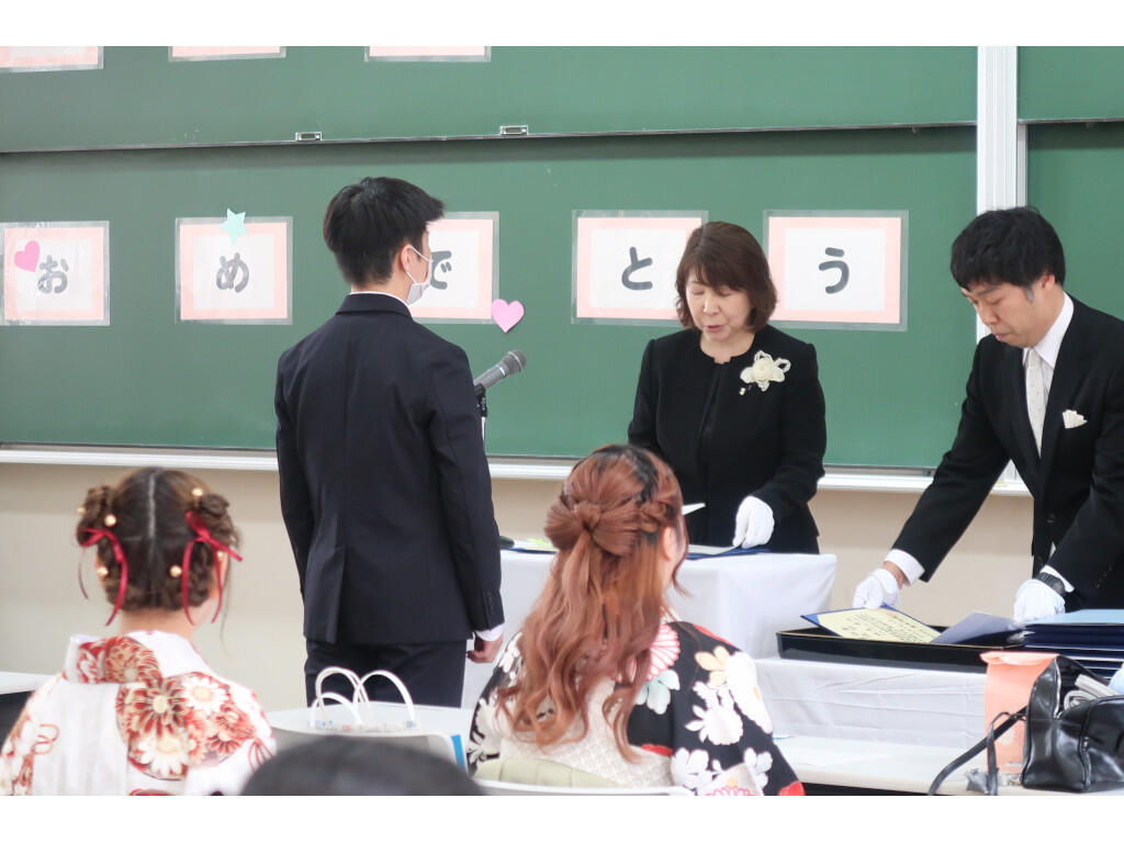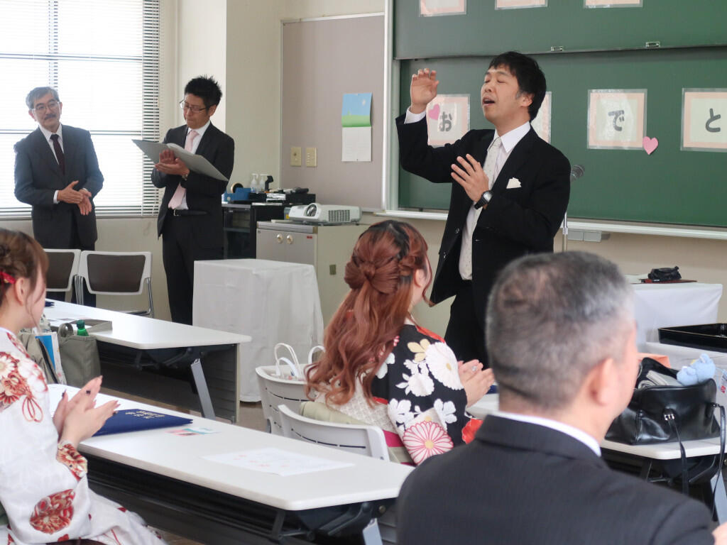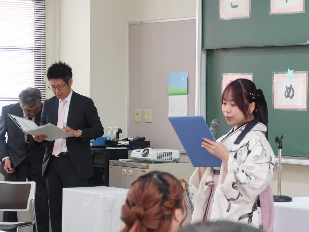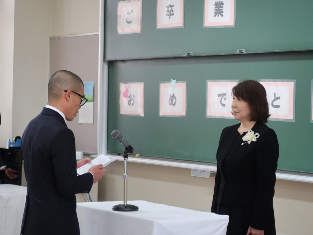 祝電披露の後、学科総代の杉本大智さんから謝辞があり、先生方やクラスメイト、そして家族への感謝の思いとともに、「本日を新たなスタートラインとし、ここで学んだ誇りと感謝を胸に、それぞれの道を歩んでまいります」と、決意を新たにしていました。